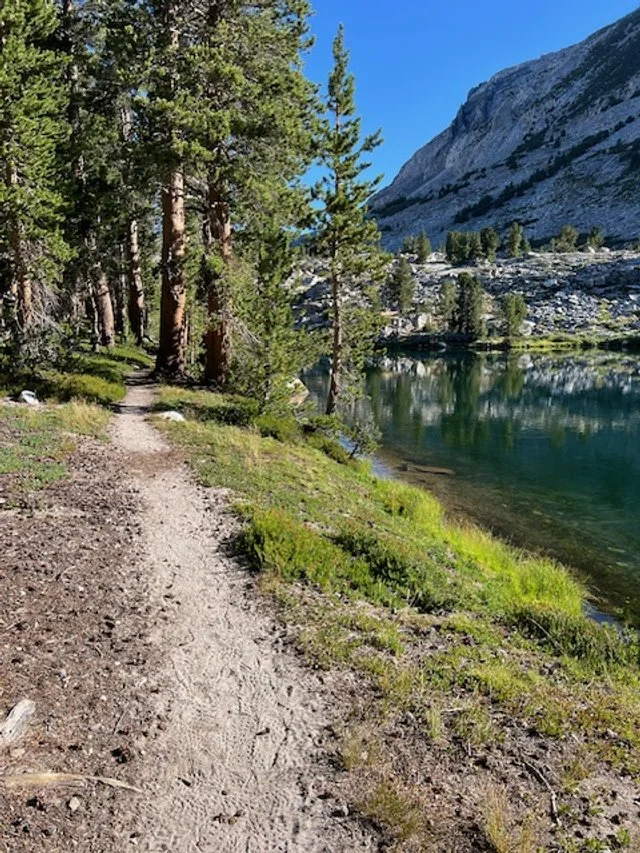 After a short break, it was time to move on and it was all downhill, thankfully. We had a 3.6-mile jaunt and passed several beautiful lakes along the way. Although it was warm, it was not as bad going downhill. You had to watch your step, but it was a lot easier walking. Our destination was Bear Creek which we eventually reached, and we were presented with another problem. Keep your shoes on and wade across, which everyone did, or go across barefoot like I did. The water was so refreshing.